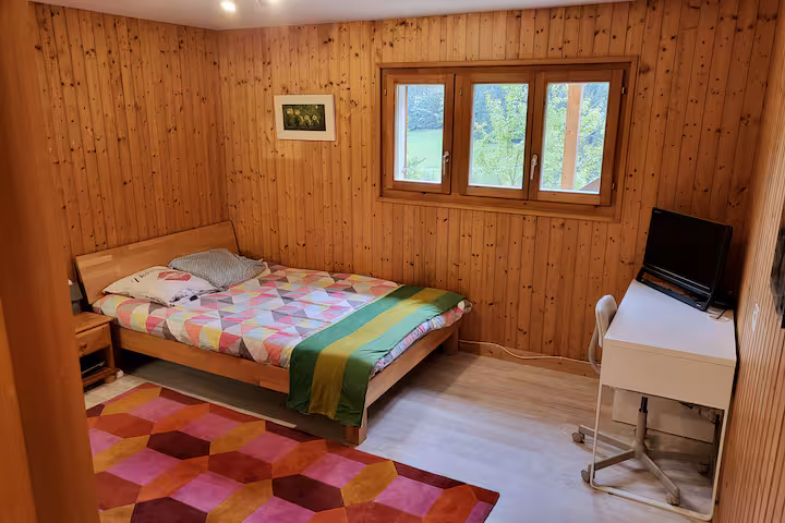 Cette chambre dispose d’un lit double 140 × 200 et de sa propre salle de bain, offrant un confort optimal et une parfaite intimité durant le séjour.